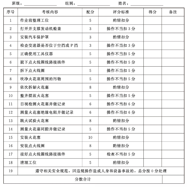 对本学习任务进行评价,如表3.4.3火花塞的检查与更换评分表所示。