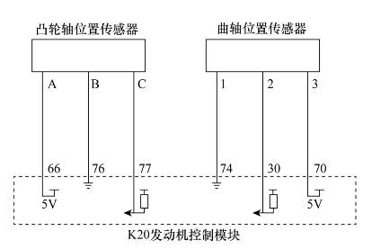 曲轴位置传感器有1、2、3三个接线端子,分别接入K20发动机控制模块端子74、30、70,对应的功能是接地、信号输出、5V电源。