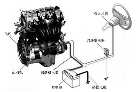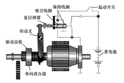 (2)电动机起动。电动机起动是用电动机作为机械动力,当将电动机轴上的齿轮与发动机飞轮周缘的齿圈啮合时,动力就传到飞轮和曲轴,使之旋转。电动机本身又用蓄电池作为电源。
