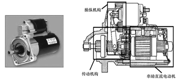 起动机一般由直流电机、传动机构、操纵机构等三大部分组成,如图5.2.2所示。
