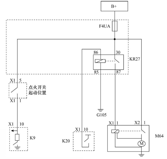 蓄电池正极——F4UA保险——KR27的触点——M64起动机(由此分两路:一路到保持线圈——搭铁;另一路到吸拉线圈——起动绕组——搭铁)。