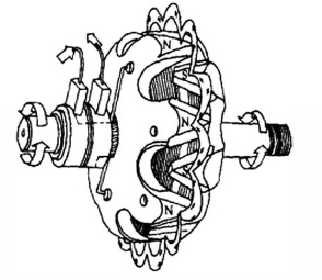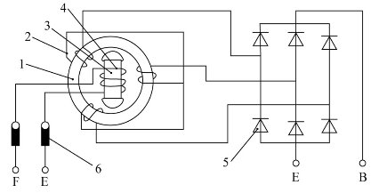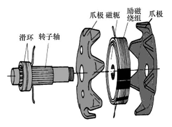 当给两滑环通入直流电时,励磁绕组中就有电流通过,并产生轴向磁通,使爪极一块被磁化为N极,另一块被磁化为S极,从而形成六对(或八对)相互交错的磁极。当转子转动时,就形成了旋转的磁场。