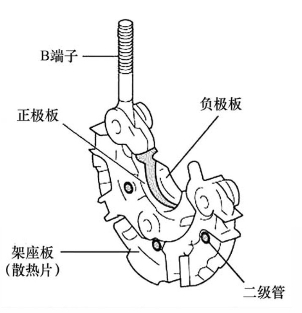 整流器的功用是将定子绕组的三相交流电变为直流电。整流器由整流板和整流二极管组成,6管交流发电机的整流器是由6只硅整流二极管分别压装(或焊装)在相互绝缘的两块板上组成的,其中一块为正极板(带有输出端螺栓),另一块为负极板,负极板和发电机外壳直接相连(搭铁),也可以将发电机的后盖直接作为负极板。6只整流二极管分为正极管和负极管两种。引出电极为正极的称为正极管,3只正极管装在同一块板上,称为正极板;引出电极为负极的称为负极管,3只负极管安装在负极板上,也可直接安装在后盖上。如图5.3.5所示。