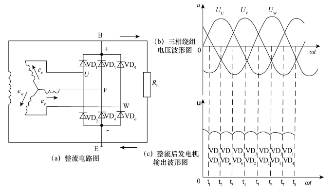 二极管具有单向导通性,当给二极管加上正向电压时二极管导通,当给二极管加上反向电压时二极管截止。将定子的三相绕组和6只整流二极管按图5.3.8(a)的电路连接,发电机的输出端B、E上就输出一个脉动直流电压,如图5.3.8(c)所示,这就是发电机的整流原理。