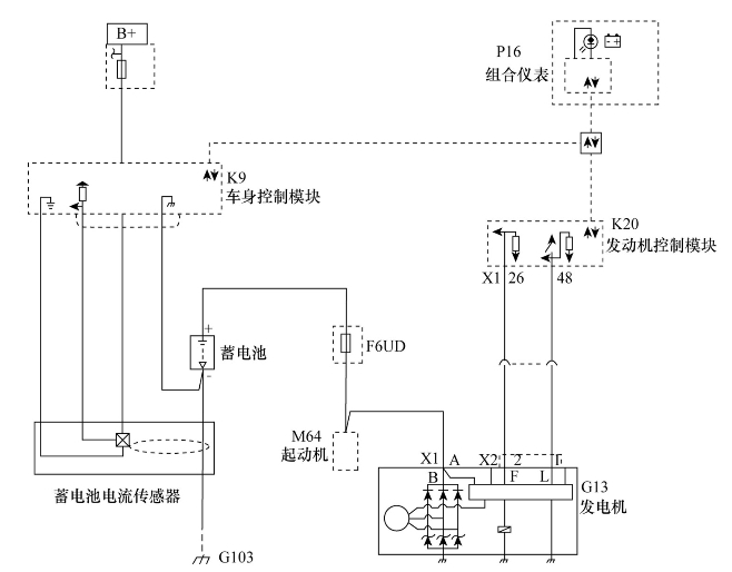 1.确认G13发电机B+输出电路X1端子1和搭铁之间的测试灯点亮。如果测试灯不点亮,测试B+电路是否对搭铁短路或开路或电阻过大。