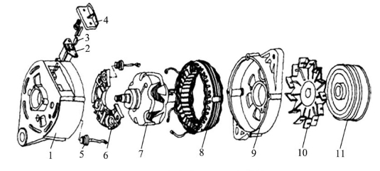 整体式交流发电机一般由转子、定子、整流器、前后端盖、风扇、带轮和集成电路电压调节器等组成。如图5.3.1所示。
