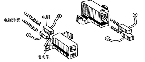 后端盖上装有电刷组件。电刷组件由电刷、电刷架和电刷弹簧组成,如图5.3.6所示。电刷的作用是将电源通过滑环引入励磁绕组。两个电刷分别装在电刷架的孔内,借助弹簧压力与滑环保持接触。电刷和滑环的接触应良好,否则会因为磁场电流过小,导致发电机发电不足。