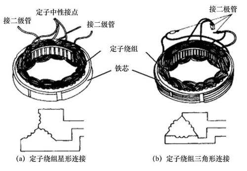 如图5.3.7所示,发电机定子的三相绕组按一定规律分布在发电机的定子槽中,内部有一个转子,转子上安装着爪极和励磁绕组。