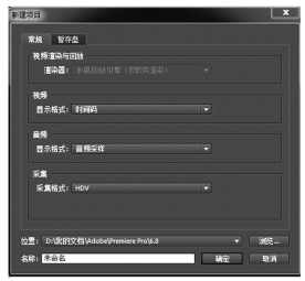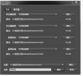 如图3-10、图3-11所示,新对话框由三部分组成,一个是“常规”,一个是“暂存盘”,还有一个是设置项目存储位置和名称的。在“常规”页面中,可以设置视音频的显示格式和采集格式;在“暂存盘”页面中,可以设置视音频的采集和预览缓存盘符。