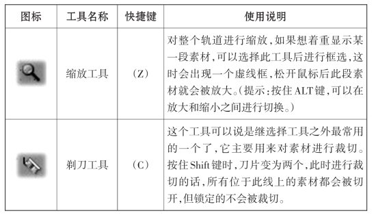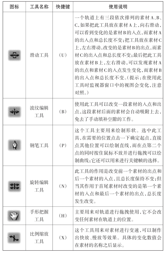 素材导入到时间线的视音频轨道上之后,就可以对素材进行移动、组合和裁剪了。为了方便剪辑师应对各种状况,Premiere专门配备了一个编辑工具窗口,内设11种工具供剪辑时使用(工具的具体使用方法见表3-2)。