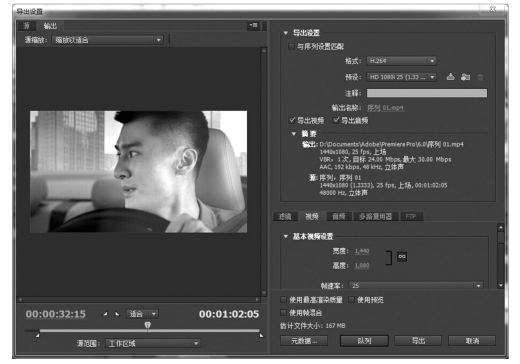 如图3-16所示,可以在此窗口设定视音频文件的名称、储存路径、视频格式、分辨率、码率等参数。当一切设定完毕,点击下方的“导出”按钮,视频文件开始生成。其生成速度受序列时长、视频格式、电脑性能等因素影响。