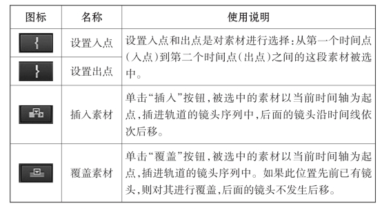 将素材从项目面板导入到时间线上有多种方法。最常见的做法是用鼠标按住素材直接“拖到”轨道上,然后松开。有时,也可以利用素材监视窗口来将素材导入到轨道上,具体做法是:设置入点——设置出点——插入或覆盖(表3-1)。从操作步骤可以看出,这种方法适用于下面的情况:某一镜头段落已经初步编辑好了,但某些地方需要修改或调整。