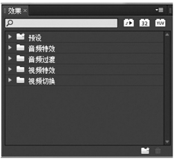 效果窗口提供了四种特效供剪辑师使用,分别是:音频特效、音频过渡(也叫转场)特效、视频特效和视频切换(转场)特效(图3-7)。