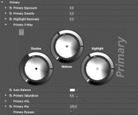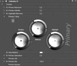 先来看一级调色。在一级调色窗口中,最醒目的部分是三个色彩环,分别为:阴影(Shadow)、中间调(Midtone)和高光(Highlight)。顾名思义,阴影、中间调和高光分别代表了镜头画面的暗部区域、亮部区域和灰部区域。这种“三分法”是后期处理画面时的通用方法,任何一个镜头画面都可以划分出最亮部分、最暗部分和中间部分。在调色时,可以分别调整三个区域色彩的明度、色相和饱和度。