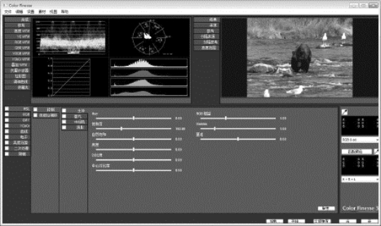 Color Finesse 3的工作界面如图3-27所示。Color Finesse 3共有3个工作面板和一个视频显示窗口,它们分别是参数分析面板、参数设置面板、色彩信息面板和视频显示窗口。除色彩信息面板外,每个窗口都有一组按钮,选择不同的按钮可以选择面板或窗口中的各项操作。