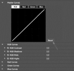 除了这几个十分方便的色彩环,Colorista还集成了调色常用的曲线(Curves),包括RGB曲线和各个通道的独立曲线。如图3-23所示,在每一个曲线的下方都有4个参数可供调节,分别是对比度(Con-trast)、阴影(Shadows)、中间调(Mids)和高光(Highs)。与其他曲线的调节方式不同的是,这里的曲线需要通过这些参数来调节,Reset键可单独对曲线数值清零。
