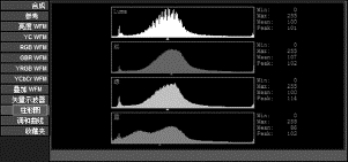 用波形监视器监测摄像机或素材文件的视频信号质量时,输出的视频信号以电子图形的方式显示在波形监视器上。Color Finesse 3中的7个波形监视器(亮度WFM,YCWFM,RGBWFM,GBRWFM,YRGBWFM,YCbCrWFM,叠加WFM)如图3-28至图3-34所示。