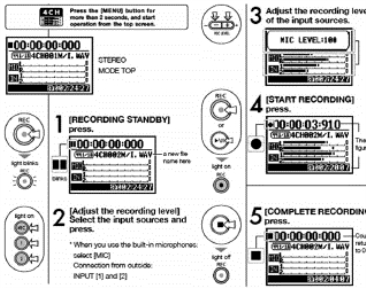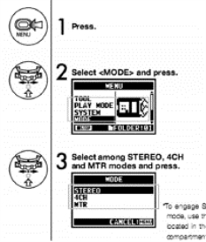 将SD卡插到机器里然后再插上电源,把电源开关向右推到底保持1.5秒以上就开机了(如此重复操作一次是关机)。推向左边的HOLD会把机器锁住,此时便无法进行任何操作了。STEREO/4CH/MTR会有一个灯点亮,代表现在处于哪种录音模式。显示屏从上到下分别显示的是当前的录音时间、电池电量、录音精度/采样率、当前录音文件名称、左右(LR)声道录入音量,最下面显示的是SD卡在当前选择的录音格式下可录入的总时间(如果开启了耐力模式那么左下角还会显示STAMINA字样)。