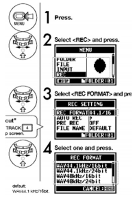 录音格式选择可以通过下图的RECREC FORMAT选择,也可以直接通过机器前面板WAV/MP3下面的【4】调出RECFORMAT(图4-3)。