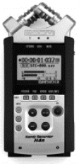 H4n是一款小巧的录音设备(图4-1),机体重量仅有280克。其内置扬声器可以直接回放而不必再戴耳机。SD/SDHC记忆卡储存录音,具有DSP效果,外部电源或者2节5号电池即可供应长时间录音达10小时的耐力模式(Stamina Mode)。H4n对于环境和现场声音能够准确录制。H4n最高支持24bit/96kHz的线性PCM录音,录音格式以WAV或者MP3保存,所录节目可以通过自带的USB接口或使用读卡器传送到电脑。