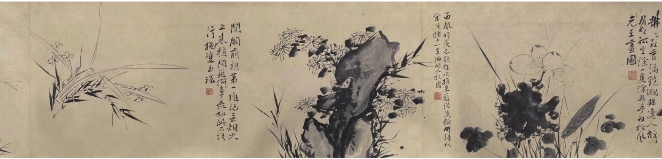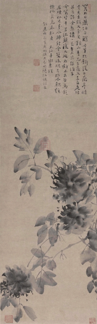 徐渭的写意花卉惊世骇俗,用笔狂放,笔墨淋漓,不拘形似,自成一家,创水墨写意画新风,与明末花鸟画家陈淳并称为“青藤、白阳”。他创作了很多墨写的牡丹和葡萄。写的是它们,说的却是自己的身世,饱含一腔牢骚。所以袁宏道赞扬他“强心铁骨,与夫一种磊块不平之气,字画之中宛宛可见”。