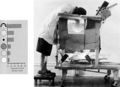 范茨运用更精确的视觉偏好装置(图3-1),来研究影响新生儿注意的发生和影响婴儿注意的刺激物特征等问题。在这一装置里,平卧于小床上的婴儿可以注视出现在小床上方的两种刺激——两种刺激在呈现时,彼此隔开一定的距离,婴儿无法同时聚焦于两个刺激,只有稍稍偏动头部,某个刺激才能完整地进入视线中。研究者可以从这个特制装置的上方,向下观察婴儿眼中的刺激物映象,一旦发觉婴儿注视某侧的刺激,研究者就按动相应一侧的按钮,以记录婴儿注视该刺激的时间。本方法的假设在于,若婴儿能够在某个刺激物上注视了更长的时间,说明他对该刺激有所“偏爱”,也就表明他区分了这两种刺激[1]。这些系列研究发现,新生儿已经具有选择性注意的能力,他们的视线能固定在外部世界的某种对象上,而且比起杂乱刺激点或线条,他们的视线更多地集中在轮廓相对清晰的图形上。