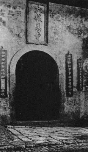 大报恩寺大门旁侧还挂有三个牌匾:南京特别市立米行街小学、南京特别市米行街民众学校、南京特别市立米行街民众阅报处。图片摄于1928年,系民国时期大报恩寺残留建筑,今已消失。