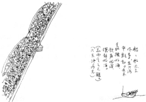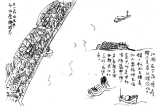 第三个,在上海。一九五七年五月一日,国际劳动节,沈从文从外滩边上的饭店窗口看外白渡桥和黄浦江,画了三幅速写,同时又用文字做了描述。