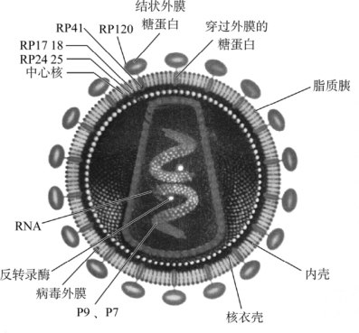 1.形态结构 HIV是D型RNA反转录病毒,多为圆形或椭圆形,直径为100~140nm。病毒核心由单链RNA、反转录酶及结构蛋白组成。核心的外面是病毒衣壳,呈20面体﹑立体对称。病毒最外面为包膜,包膜上有棘突、含有与宿主结合的部位(图1 -1)。