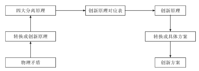 应用分离原理解决物理矛盾,解题模式也是套一个公式:“把具体矛盾转换成创新原理,再把创新原理转换成具体方案”,查一张表:“分离原理与创新原理对应表”;基本方法也是完成两个过程(图3-3)。