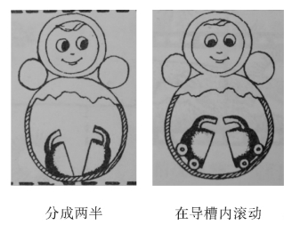 把创新原理联系不倒翁的实际,原理“分割”,分割什么呢?不倒翁只有一个外壳和一个重块,显然,只有分割重块才是有意义的,也就是把重块一分为二(图4-19),一分为二有什么意思呢?再联系第二个创新原理“动态化”,这就是提示让一分为二的重块动起来,当然不能乱动,于是(图4-19右图),在两个重块上安装了滚子,并限制在一圈的导槽内移动,这样,就把两个创新原理,转换成了一个具体的方案。如此创新的不倒翁,和原来的不倒翁相比,具有一些特殊的表现,可倒立,可平放,摆动中的频率是变化的。一般都难以想像的,这么简简单单的不倒翁还能再创新,再改变。