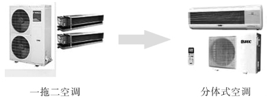 要把创新原理“提高系统的可分性”具体化。分体式空调机一共分三个部分:室外机、室内壁挂机、遥控器。该提高哪一部分的可分性?把室外机一分为二似乎没有必要,遥控器也没必要分成几部分,看来,唯独壁挂机具有可分性。分体式空调机一般都是一个室外机拖一个室内壁挂机,一般家庭都有两间房或三间房,每个房间都要装空调,一个壁挂机就不够用了,这就要求把壁挂机一分为二或一分为三,于是,就要出现一拖二或一拖三分体式空调机(图4-3),也就是“提高系统可分性”得以实现。这是家庭中央空调的概念。这里,从创新原理检核,看到空调机的一个发展趋势。也许认为讲这已知的东西没有必要。至少从这里学到模仿——再分割。