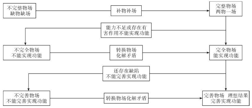 即对不具备3要素的不完整物场通过补物、补场,使其成为一个完整物场。结果出现两种情况,这个完整物场能实现功能,在框图上就往下走;另一种情况,由于有害作用和能力不足严重,不能实现功能,就成为不完全物场,进入第2层次。