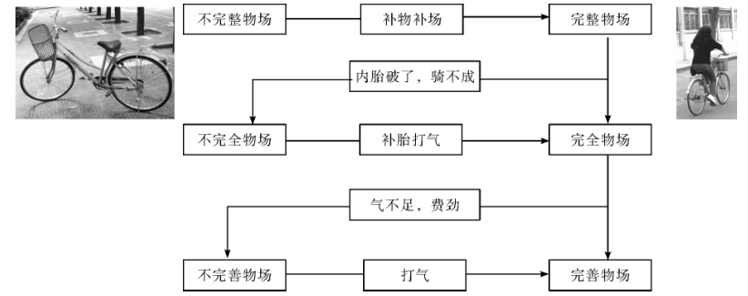 一辆自行车只是一物,是一个不完整物场。补物补场,就是人骑上去用脚踏,于是构成一个具有3要素的完整物场。如果一切都很正常,这个完整物场就能完善地实现一个骑行功能,直往下行,成为一个完善物场。如果内胎破了,骑不成,虽是完整物场也不能实现骑行功能,成为不完全物场。进入第2层次。
