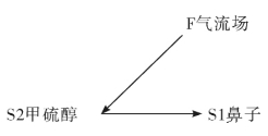 要监控的对象是钻头的钻齿。钻头在很深的钻管的下面,看不见摸不着,一旦钻齿破损了,如果能发送一个什么信号到地面上来,让人接收,监控的目的就达到了。应该是什么信号呢?光、声、电?在小小的钻齿上应用这些技术,显然复杂了。能不能更简单一点。如果能传送一种气味如特别臭的气味到地面上来,就知道钻齿破损了。具体的方法是,把装有极臭物质甲硫醇的胶囊封装在钻齿内,这个甲硫醇就代替了钻齿,一旦钻齿破损,甲硫醇就会漏出,臭气在气流的作用下,通过钻管传到地面,被人闻到,判断钻齿破损。这个检测钻齿破损的物场模型如图5-27所示。