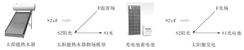 练习2:阳光就是一物一场:S2太阳光线+F温度场。再加上一物S1,就构成一个完整物场,实现一个功能,其实这就是太阳能的利用(图5-68)。太阳能已经得到广泛应用。下面列举太阳能热水器和太阳能发电两个例子及其物场模型,然后请列举更多的太阳能应用的案例及其物场模型,特别是根据自己的创意所产生的新概念设计。都要画出一物一场太阳能利用物场模型。