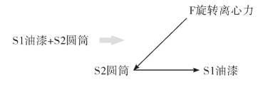 应用两物一场的概念。这里有两个物,圆筒表面和它上面的油漆,需要补充一个场。画物场模型。补充一个什么场能使油漆减少?自然会想到用甩的办法,用离心力把多余的油漆甩掉,留下薄薄的一层。具体实施是使圆筒高速旋转,靠离心力甩掉油漆。所以是补充一个机械场(图5-48)。