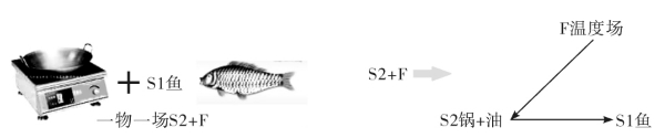 炉子上的锅烧热了,就是一物一场,S2锅和F温度场,正是两物一场三缺一,就缺一个物S1。赶快把要烧的鱼S1补充进锅里头,构成一个两物一场的完整物场,实现一个烧鱼的功能。物场模型如图5-55。