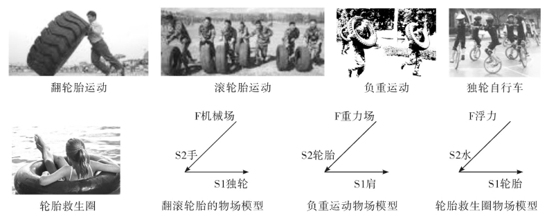 一个轮胎,由于它具有多种属性,如圆形、环形、外圆、内圆、质量、内空、弹性、尺寸,以及与它的应用相关的方方面面,它可以应用在很多场合,补充一物一场,构建完整物场,完成一个功能。下面列出已经被应用的场合,并画出了物场模型(图5-41)。还能进行一些补充吗?