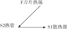 4)把热管用于降低车刀的切削温度。切削速度就代表了生产率。但是切削速度过高,切削温度很高,刀片材料难以承受。所以,降低刀片温度很重要。以往是给刀片上浇冷却液,效率不高。在刀体上打孔,直通刀片下面,做成热管,把刀片热量快速散出,即可提高切削速度。这个热管散热的物场模型如图5-37。