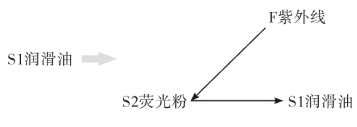 只有一物润滑油S1,要求的功能是检测出来。要补充一物一场。根据经验,要用一种特殊的光线去照,应该是紫外线F。可是紫外线与润滑油不发生作用。什么东西能与紫外线发生作用呢?那就是荧光粉。荧光粉受紫外线照射会发光,于是把荧光粉混合在润滑油中,补充了一物S2。用紫外线照射发现有发光物质,说明润滑油有渗出。加物加场的物场模型如图5-23所示。