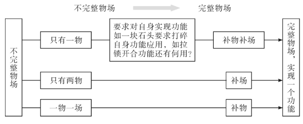 不完整物场有3种情况:如图5-21所示,只有一物、只有两物、只有一物一场。补物补场,缺啥补啥,构成两物一场的完整物场,就是一个新的系统,实现一个功能,产生一个新的产品。