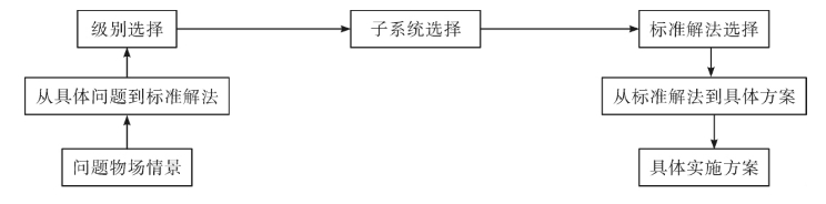 从标准解法到具体方案。解决物场矛盾,根据已经查出的标准解法的引导,就是在问题物场的基础上,引入物或场,添加新的物或场,进行物或场的置换,对物场进行种种变换,以完善地实现功能,或进一步提高系统性能。查得的标准解法也只是这样一般的叙述,还要根据具体的问题物场的实际情况,把要引入、添加、置换的物或场具体化,得到解决方案,这就是从一般到特殊的过程。在这个过程中,主要依靠逻辑分析,具体化就是要选择、确定引入、添加、置换的具体的物或场,以及具体的实施方法。其中,要考虑系统内外资源的利用,要考虑最终理想解。形成具体方案后,用第5级中的17个标准解法进行检验,是否可以简化。