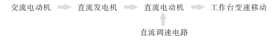 龙门刨床工作台在前进切削的时候速度要慢,后退不切削的时候速度要快,也就是要对工作台的运动进行调速。过去技术落后,只有直流调速比较简单,所以要先用交流电动机带动直流发电机发电,再带动直流电动机,并由直流调速电路对直流电动机调速,再驱动工作台往复变速移动。其能量传递路径很长,如图6-15所示。