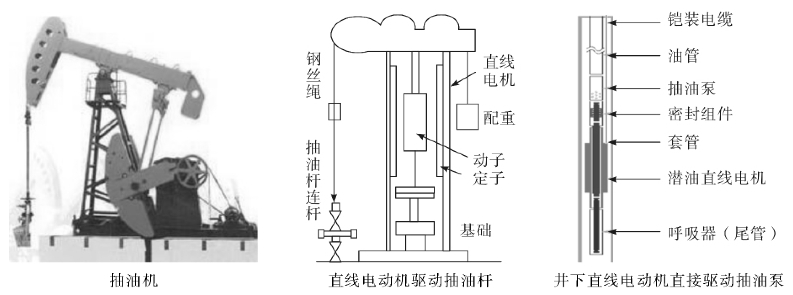 即使采用直线电动机传递路径比原来是短了,但很长的抽油杆还是原状,传递路径还是长,而且抽油杆还是一个引发事故的原因。所以,能去掉抽油杆,不仅使传递路径进一步缩短,而且还能减少事故。如果把抽油杆去掉,显然,就是要把直线电动机代替抽油杆,直接深入井下与抽油泵连接。这样一次又一次地缩短传递路径,把机械传动装置及很长的抽油杆,全都裁剪掉了,如图6-16所示机构大大简化,能源利用效率得到提高。
