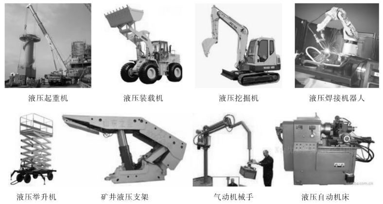 例2:有一些机器采用机械传动结构,控制困难,而且结构也复杂。如果采用液压气动传动,控制就会变得容易,结构也变得简单(图6-19)。如图中的液压起重机、挖掘机、举升机,乃至液压自动机床,都是采用直线运动的油缸驱动作往复运动,油路用阀门易于控制。这些场合如果采用机械传动,结构就会复杂而且庞大,又不易控制。所以增加能源的可控性,也是一项重要的能源传递法则。