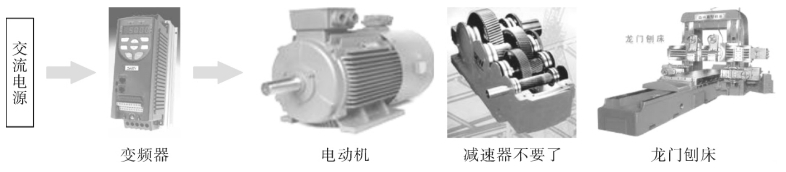 交流电源经过变频器再接入电动机,改变变频器的频率,也就改变了输入电动机的电源频率,因而改变了电动机的转速,用这种方法可以对电动机进行无级调速,电动机后面的各种变速机构都可以去掉,也就是用变频器代替了各种变速机构,缩短了能量传递路径并减少了能量损失。