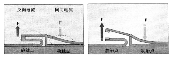 工作原理如图6-17。当电路短路时电流很大,电磁脱扣器衔铁被吸合向上运动,推动垂直杆上移顶起搭钩,锁扣在弹簧力的作用下,带动动触头左移,断开电路;断路器必须断得快,才能起到保护作用,可是这里采用电磁衔铁机械传动,惯性大,有间隙,能量传递路径长,动作慢,性能差;要动作快,显然不能用机械传动,要缩短能量传递路径;于是把机械传动机构全部裁剪掉,利用安培电流效应——同向电流的平行导线相吸,异向电流的平行导线相斥,做成了直接利用短路电流断路的断路器,大大缩短了能量传递路径,而且结构大大简化,如图6-18所示。短路时短路电流很大,左半边流向相反产生的斥力和右半边流向相同产生的吸力都足够使触头打开。