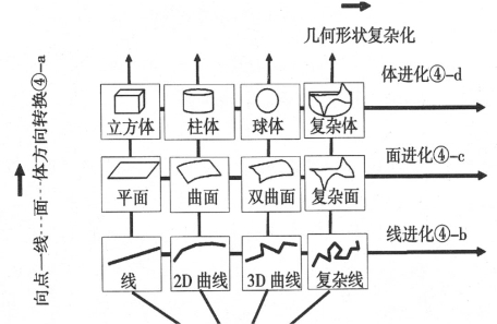 1)形状协调进化路线如图6-67。向两个方向发展:一是向点、线、面、体;二是向几何形状复杂化。