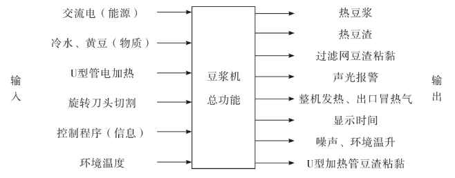 以框图形式全面、完整列举豆浆机输入、输出内容。对输入输出内容,提出问题,并综合应用各种创新方法,如技术矛盾、物理矛盾、物场矛盾、物理效应等,一般都可能产生新的创意,实现创新,使产品功能系统得到改善,也使产品朝理想化的方向发展进步。